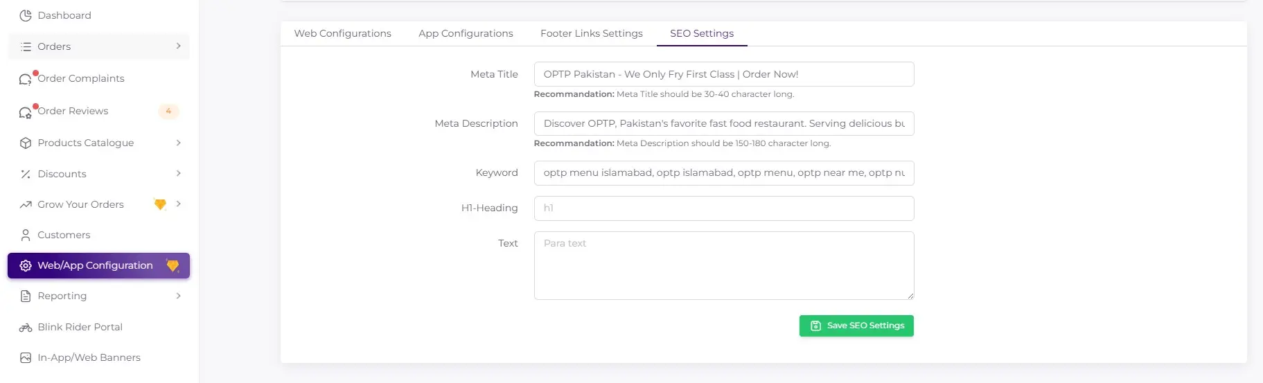 Navigate to: Web/App Configuration → SEO Settings (Tab)